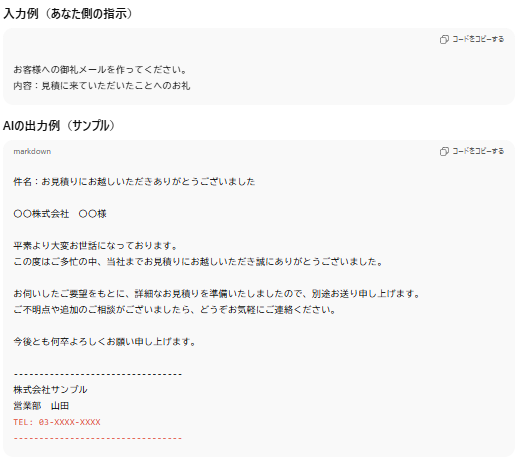 ゼロから文章を考えるより圧倒的にスピーディーで、これまで30分かかっていた作業が10分ほどで済むことも。社内報告やちょっとした案内文など、毎日繰り返す業務こそAIに助けてもらうと効果的です。
