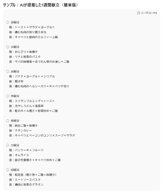 例えば以下はAIに依頼して作ってもらった1週間の献立の簡単版です。これをもとに買い物リストを作れば、無駄な出費も減り食費の節約にもつながります。